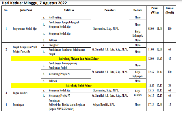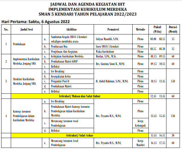 In House Training (IHT) Implementasi Kurikulum Merdeka di SMAN 5 Kendari Tahun Pelajaran 2022/2023 yang dihadiri Bapak/Ibu Guru SMAN 5 Kendari yang bertempat di Aula SMAN 5 Kendari Pada Hari Sabtu Tanggal 6 Agustus sampai 7 Agustus 2022