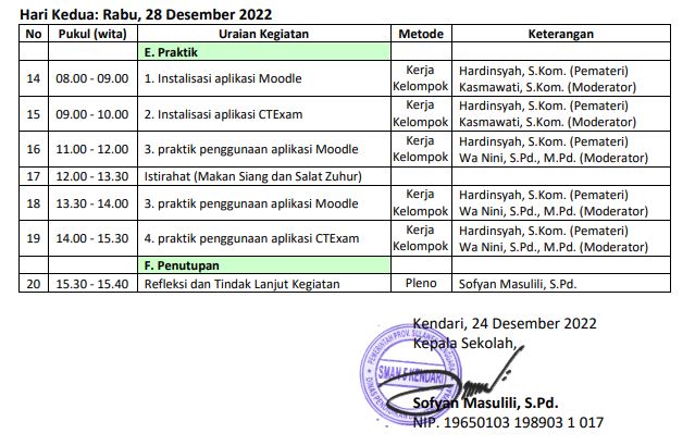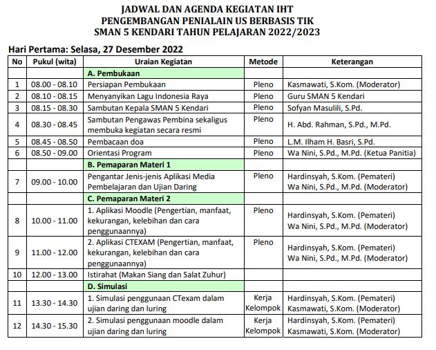 Pelatihan In House Training (IHT) SMA Negeri 5 Kendari Pengembangan Penilaian Ujian Sekolah Berbasis Teknologi Informasi dan Komunikasi, dibuka langsung oleh Kepala SMA Negeri 5 Kendari Sofyan Masulili, S.Pd. dan Sambutan Pengawas Pembina sekaligus membuka kegiatan secara resmi H. Abd. Rahman, S.Pd.,M.Pd. yang berlangsung pada hari Selasa s.d. Rabu, tanggal 27 s.d. 28 Desember 2022 bertempat di Aula SMAN 5 Kendari.