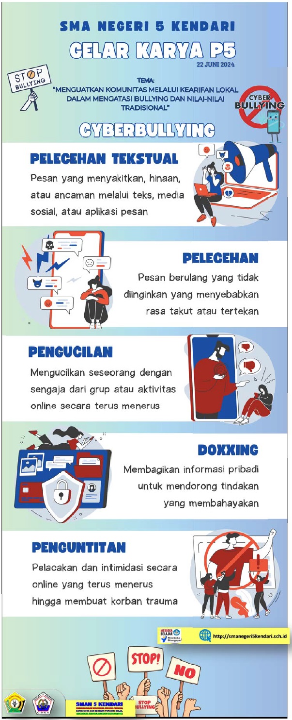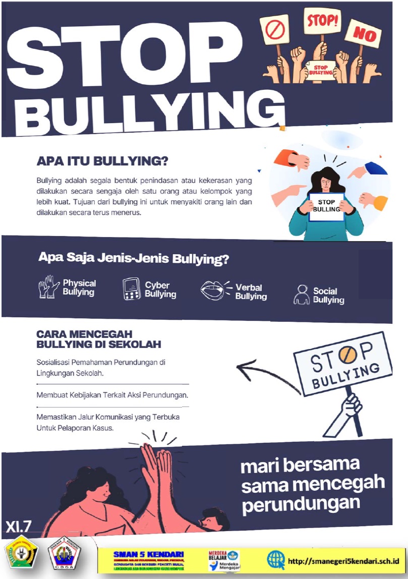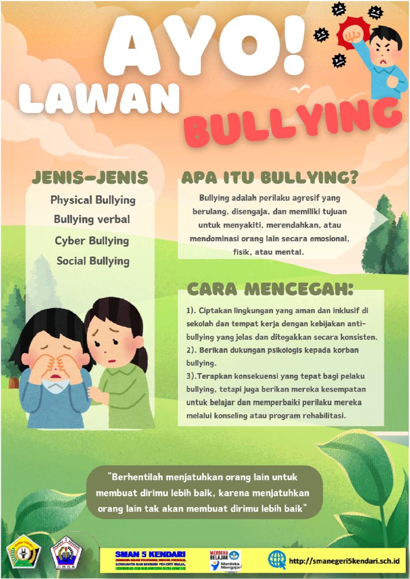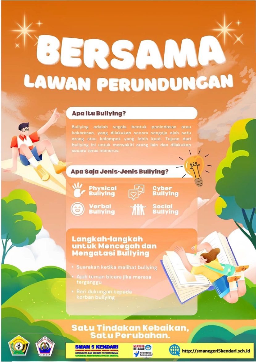 Pencegahan perundungan di lingkungan SMAN 5 Kendari telah dimulai semenjak semester 1 tahun pelajaran 2023/2024 melalui kegiatan “Sosialisasi Pencegahan Perundungan di Lingkungan SMAN 5 Kendari”. Kegiatan tersebut melibatkan 1.000 peserta didik, semua Pendidik dan Tenaga Kependidikan SMAN 5 Kendari. Kegiatan berlangsung selama 5 kali pertemuan, yaitu: