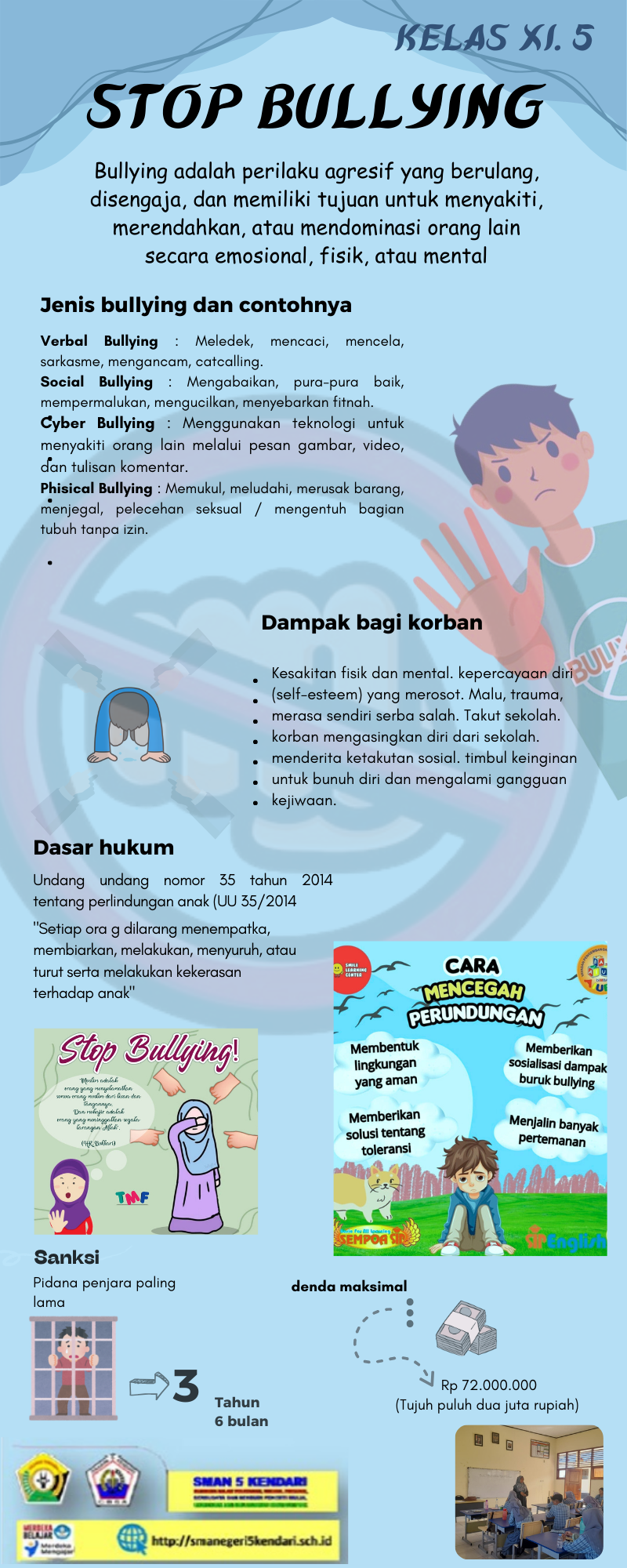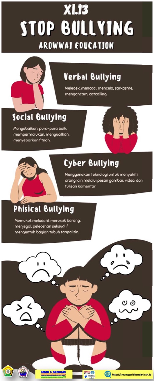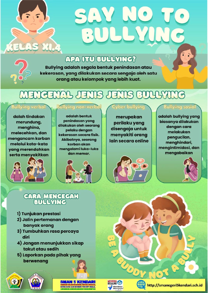 Pencegahan perundungan di lingkungan SMAN 5 Kendari telah dimulai semenjak semester 1 tahun pelajaran 2023/2024 melalui kegiatan “Sosialisasi Pencegahan Perundungan di Lingkungan SMAN 5 Kendari”. Kegiatan tersebut melibatkan 1.000 peserta didik, semua Pendidik dan Tenaga Kependidikan SMAN 5 Kendari. Kegiatan berlangsung selama 5 kali pertemuan, yaitu: